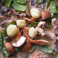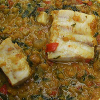 Fisch portionieren und mit Salz und Pfeffer würzen. Tomaten hablieren, entkernen und klein würfeln. Lauch in Ringe, Sellerie schälen und klein schneiden. Ingwer schälen und reiben. Öl in einer Pfanne erhitzen und die Gewürze anrösten. Ingwer, Tomaten, Lauch, Sellerie und Linsen dazu geben und kurz andünsten. Mehl darüber streuen, verrühren und mit der Suppe ablöschen. Bei schwacher Hitze zugedeckt ca. 15 Minuten köcheln, gelegentlich umrühren und eventuell etwas Flüssigkeit nachgießen. Spinat zum Gemüse geben, Fisch darauf legen und zugedeckt 10 Minuten ziehen lassen. Aus der Pfanne nehmen, Jogurt unterrühen, mit Salz und Pfeffer abschmecken,Fisch wieder zurück in die Pfanne und alles kurz erhitzen. |