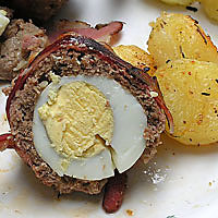 des Faschierten um das Eier herum formen. 2 Speckscheiben um das Ei