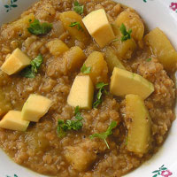 Linsen zufügen, gut durchrühren, mit Koksmilch und Suppe aufgießen.