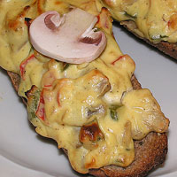 Weckerl in gleichdicke Scheiben schneiden und die Pilzmasse darauf